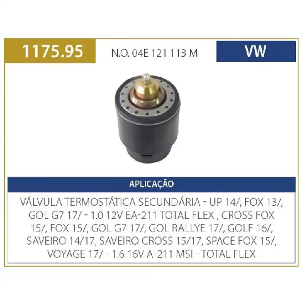 VALVULA TERMOST VW UP! 14/ FOX 13/ GOL GVII 17/ VW UP! 1.0 12V 14/ (SECUNDARIA) (MOTOR EA-211/A-211) FOX 1.0 13/ GOL G7 1.6 17/ GOLF 1.6 16/ SAVEIRO 1.6 14/17 SAVEIRO CROSS 1.6 15/17 SPACE FOX 1.6 15/ VOYAGE 1.6 17/ VALVULA TERMOSTATICA VW UP! 1.0 12V 3CIL 2014 A 2021 - SECUNDARIA CROSSFOX 1.6 16V 2015 A 2020 FOX 1.0 12V 2013 A 2020 GOL G7 1.6 16V 2017/ GOLF 1.4 TSI 2016 A 2019 NIVUS 200 1.0 12V TURBO 2020/ POLO 1.0 12V 2018 A 2021 SAVEIRO 1.6 16V 2014 A 2017 SPACEFOX 1.6 16V 2015 A 2021 T-CROSS 200 1.0 2010/ T-CROSS 250 1.4 TSI 2020/ TAOS 1.4 TSI 2021/ VIRTUS 1.6 16V 2018 A 2021 VIRTUS 1.4 16V TURBO TSI 2018/ VIRTUS 1.0 12V TSI 2018 A 2022