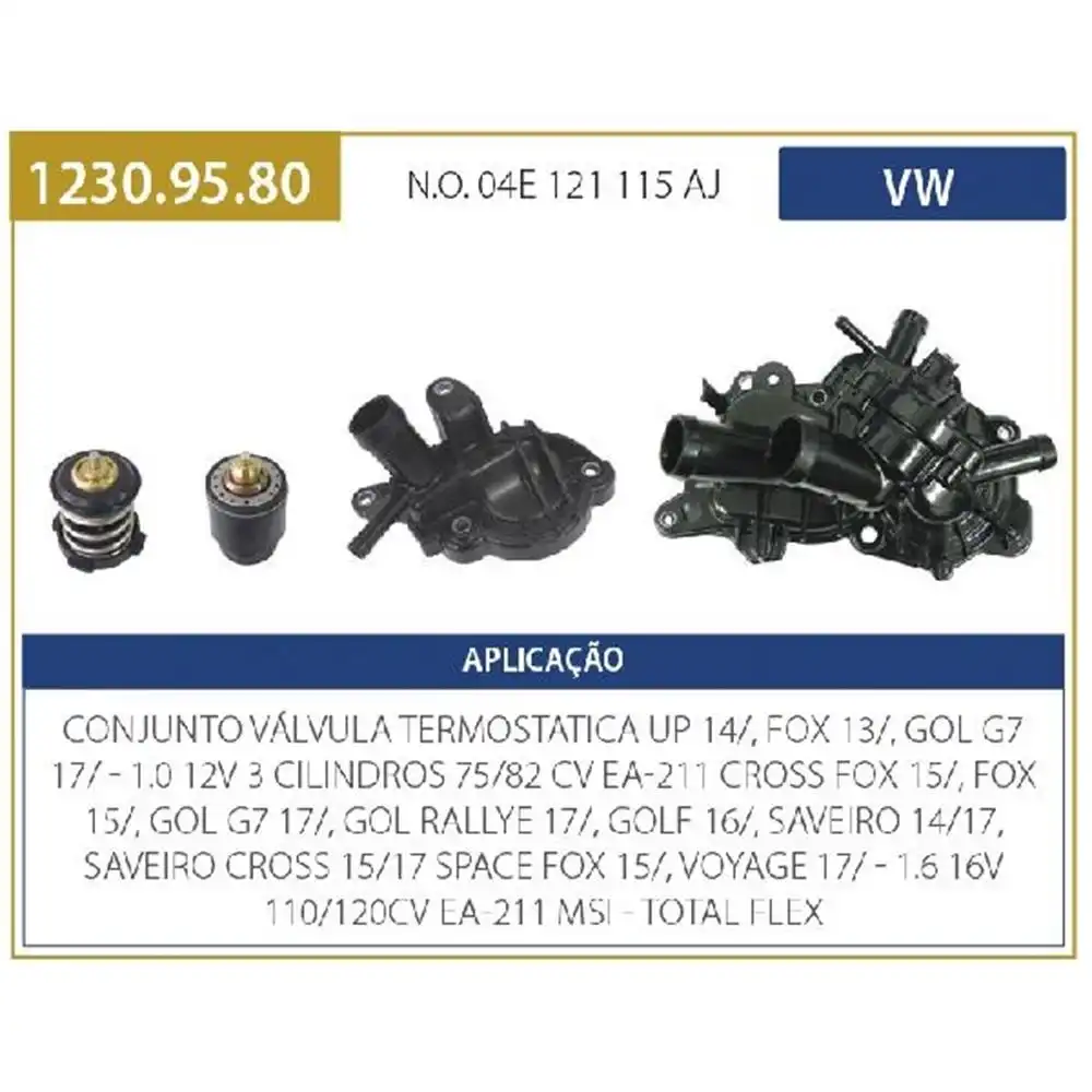VALVULA TERMOST GOL GVII 1.6 16V EA211 17/ FOX 1.0 12V 13/ VALVULA TERMOSTATICA GOL G7 1.6 16V 2017/ COM CARCACA CROSSFOX 1.6 16V 2015/ FOX 1.6 16V 2015/ FOX 1.0 12V 3CIL 2013/ GOLF 1.6 16V 2016/ SAVEIRO G6 1.6 16V 2014 A 2017 SPACEFOX 1.6 16V 2015/ VW UP! 1.0 12V 3CIL 2014/ VW GOL G VII 1.6 16V EA211 MSI 17/ FLEX VW GOLF 1.6 16V EA211 MSI 16/ FLEX VW SAVEIRO 1.6 16V EA211 MSI 14/17 FLEX VW FOX 1.0 12V 3C EA211 13/ FLEX VW FOX 1.6 16V EA211 MSI 15/ FLEX VW CROSSFOX 1.6 16V EA211 MSI 15/ FLEX VW SPACEFOX 1.6 16V EA211 MSI 15/ FLEX VW UP! 1.0 12V 3C EA211 14/ FLEX